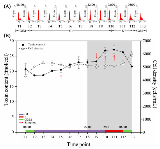Cell cycle phase, cell density and intracellular toxin content of ACHK-T. The time interval between each time point is 2 h. (A) Cell cycle phase distribution. The X-axis is the relative amount of DNA and Y-axis is the number of cells in a sample containing a particular amount of DNA. The peak patterns indicate different cell cycle phases. (B) Curves of cell density and intracellular toxin content. The colorized line above the X-axis shows the cell cycle phase distribution obtained in subfigure (A). The grey box corresponds to the dark period and the red arrows represent the time points when samples were collected for RNA-seq. The toxin contents were reported as the mean of biological triplicates with standard deviation. (n = 3, T5-vs-T9: p-value = 0.000; T9-vs-T10: p-value = 0.000; T10-vs-T11: p-value = 0.722; other p-values are shown in Supplementary Files S6).