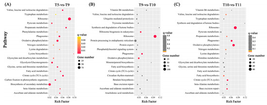 KEGG enrichment analysis of all DEGs from each comparison. The top 20 represented pathways are shown in the scatterplot for (A) comparison T5-vs-T9, (B) comparison T9-vs-T10 and (C) comparison T10-vs-T11. All enriched pathways are listed in Supplementary File S2. The rich factor is the ratio of DEGs number to the total gene number in a certain pathway. The size of the dots represent the gene number. The color of dots indicates the scopes of q-value (≤0.05) and the grey dots indicate the pathways were not significantly enriched (q-value > 0.05).