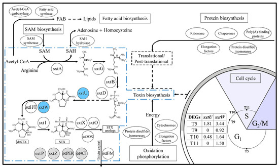 The scheme shows the toxin biosynthesis pathway as well as significantly altered genes and biological processes within a cell cycle. The revised toxin biosynthesis pathway is shown in the blue dotted line box (cited and modified from previous reports [6,9,43]). All of the identified sxt genes are labeled with solid circles: the blue circles show the sxt genes with significant variations of expression within the cell cycle; the grey circles represent the sxt genes without exact functions in toxin biosynthesis of dinoflagellates. The alterations of genes and pathways indicated a translational or post-translational regulation of toxin biosynthesis in A. catenella. The abbreviations are: SAM: S-adenosyl-methionine; SAH: S-adenosyl-homocysteine; FAB: fatty acid biosynthesis.