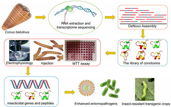 However, the functional characteristics of these conotoxins have been rarely reported. There have been only a few reports on the insecticidal activity of peptides, and no highly effective insecticidal conotoxins has been identified. With references from the literature [16], we can screen out certain conotoxins with potential insecticidal activity in our previously established library of peptides using homologous alignment. High insecticidal activity can be subsequently verified through insecticidal bioassays and chemical assays (such as MTT assay). Molecular targets can be further identified by homology modeling and electrophysiology. The main purpose of this work is to screen out conotoxins with high insecticidal activity, which can be used as synergistic genes for construction of recombinant baculoviruses (for subsequent produce of efficient and safe bio-pesticides) or generation of transgenic crops (Figure 1).