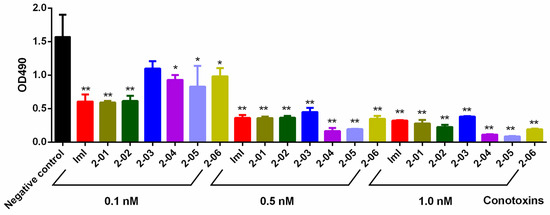 Inhibitory effects of conotoxins on growth of insect sf9 cells. Significance (compared with the negative control): * p < 0.05; ** p < 0.01.