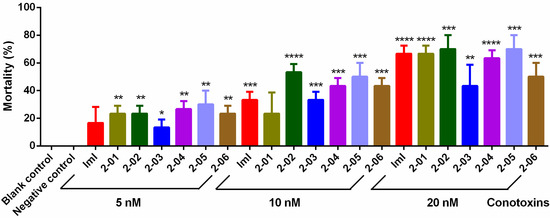 Insecticidal effects of conotoxins at different concentrations. Columns represent the mean ± SEM for three replicates of 10 insects for each dose. Significance (compared with the negative control): * p < 0.05; ** p < 0.01; *** p < 0.001, **** p < 0.0001.