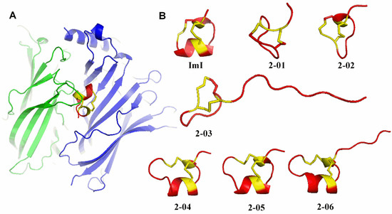 Based on the reported structure of ImI (PDB: P50983), we predicted 3D structures of the achieved six conotoxins (Figure 4) by using homology modeling [20]. Similar to ImI, these predicted structures are stabilized by two intrachain disulfide bridges with the representative pattern of Cys1–Cys3 and Cys2–Cys4 (Figure 4A). As a α-conotoxin, ImI performs actions by binding to acetylcholine receptors, where the number and attributes of amino acids between loop 1 (between the first and third cysteines) and loop 2 (between the second and the fourth cysteines) are variable and determine selectivity of the corresponding nAChR subtypes [17,21]. Since the N-terminal sequences and length affect the biological activity of peptides [22], we propose similar insecticidal activity among four achieved conotoxins (2-01, 2-02, 2-04 and 2-05) and ImI, based on their similar structures (Figure 4B). Nevertheless, the N-terminal sequences of conotoxins 2-03 and 2-06 are so long to reduce the insecticidal activity, which are consistent with the MTT assay data and insect bioassay data. Therefore, these predicted structures by homology modeling are instructive for functional prediction and validation. This seems to be a good method for low-cost and highly-efficient screening of potential candidates before performance of expensive experimental validation.