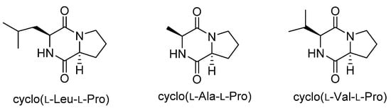 - Yan, P.S.; Song, Y.; Sakuno, E.; Nakajima, H.; Nakagawa, H.; Yabe, K. Cyclo(l-Leucyl-l-Prolyl) produced by Achromobacter xylosoxidans inhibits flatoxin production by Aspergillus parasiticus. Appl. Environ. Microbiol. 2004, 70, 7466–7473. [Google Scholar] [CrossRef] [PubMed]