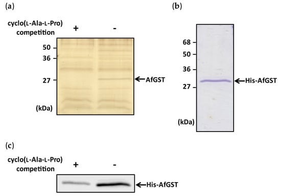 A pull-down experiment with a recombinant protein was performed to confirm the binding of cyclo(l-Ala-l-Pro) to AfGST. His-tagged recombinant AfGST (His-AfGST) was bacterially expressed and purified (Figure 2b). His-AfGST bound clearly to LL-beads, as shown by the same assay depicted in Figure 2a, and the intensity of the band became very weak when cyclo(l-Ala-l-Pro) was mixed with His-AfGST before incubation with LL-beads (Figure 2c). These results indicated the specific binding of cyclo(l-Ala-l-Pro) to AfGST.