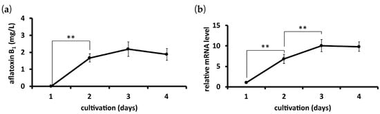 Time courses of aflatoxin B1 production and mRNA level of the gene encoding AfGST. Strain IMF 47798 was cultured in a PDB liquid medium for 4 days, and the time courses of aflatoxin B1 production (a) and the mRNA level of the gene encoding AfGST (b) were measured. Error bars show the standard deviations. n = 4 or 5, ** p < 0.01 between timepoints.