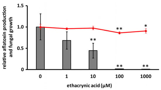 Effects of ethacrynic acid on aflatoxin production and fungal growth. The bar graph and polygonal line graph show aflatoxin B1 production and dry mycelial weight, respectively. Error bars show standard deviations. n = 3 or 4, ** p < 0.01, * p < 0.05 vs. control.