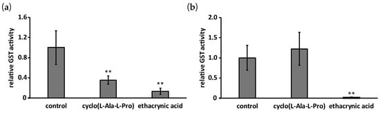 Effects of cyclo(l-Ala-l-Pro) (2 mM) and ethacrynic acid (100 μM) on GST activities of His-AfGST (a) and Schistoma japonicum GST (rShGST) (b). Error bars show standard deviations. n = 3 or 4, ** p < 0.01 vs. control.