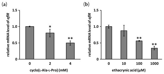 Effects of cyclo(l-Ala-l-Pro) (a) and ethacrynic acid (b) on the mRNA level of aflR. Error bars show standard deviations. n = 3 (b) or 4 (a), * p < 0.05, ** p < 0.01, vs. control.