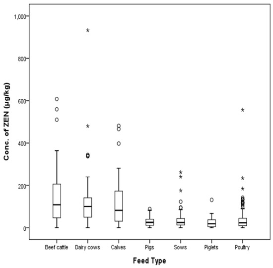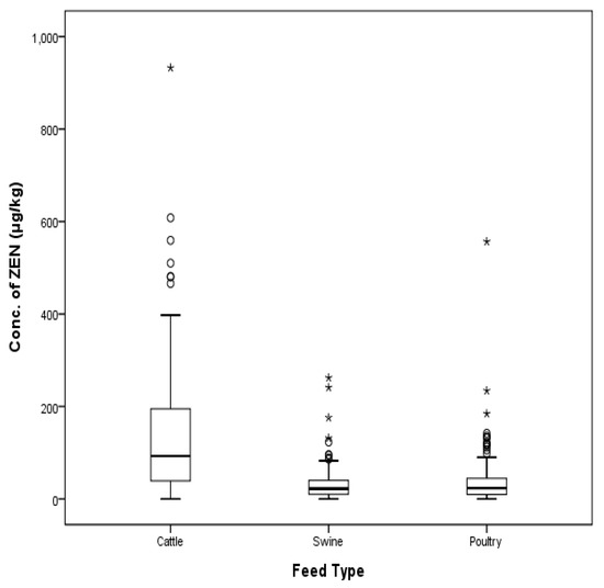 12], which was performed separately in other research project with different samples, similar results were found in the contamination levels of the ZEN in animal feeds. Most compound feeds for cattle were contaminated with this mycotoxin, and the highest level of ZEN contamination was 405 µg/kg in cattle fatting feeds.