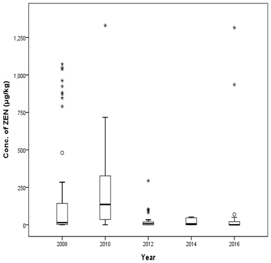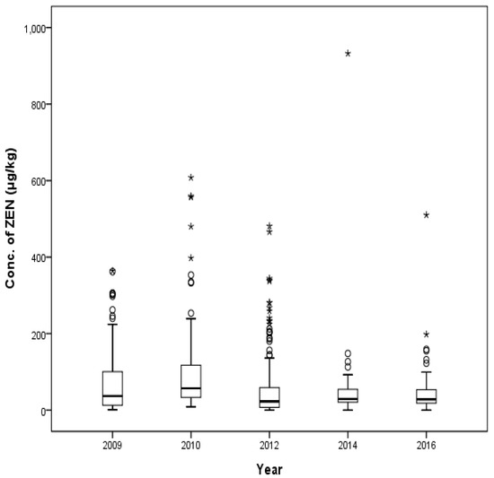 8]. In Croatia, 93% of 30 growing pig feeds were contaminated with ZEN over a range from 8.93 to 866 μg/kg, and the mean contamination level was 184 μg/kg. Contamination levels of ZEN in five feed samples exceeded the EU commission regulation (250 μg/kg) [