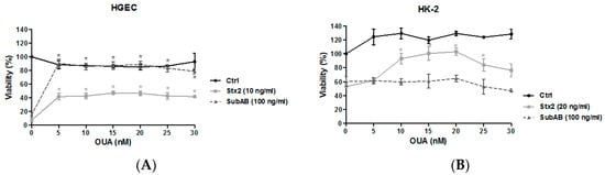 2.2. OUA Protected Human Renal Cell Viability from Cytotoxic Effects of Stx2 and SubAB