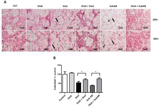 2.3. OUA Prevented Morphologic Alterations and Cell Detachment Induced by Stx2 and SubAB