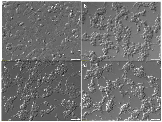 Bright field relief contrast images of SiMa cells pre- and post-differentiation, and post-treatment with BoNT. SiMa cells were initially cultured in basal medium (a), and then differentiated in serum-free medium on Biocoat™ 6-well plates in the presence of 25 µg/mL GT1b for 72 h (b). Differentiated cells after treatment with either BoNT/A (c) or BoNT/E (d), both at 200 LD50/mL for a further 48 h. Scale bars represent 50 µm.