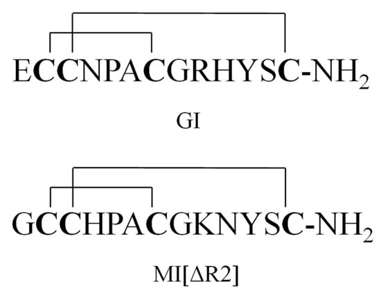- Sato, K.; Yamaguchi, Y.; Ishida, Y.; Ohizumi, Y. Roles of basic amino acid residues in the activity of μ-conotoxin GIIIA and GIIIB, peptide blockers of muscle sodium channels. Chem. Biol. Drug Des. 2015, 85, 488–493. [Google Scholar] [CrossRef] [PubMed]
