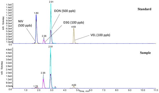 For the analysis of mycotoxins, DON, NIV, and D3G were analyzed by an LC-MS/MS method, using VEL as an internal standard. Optimization of LC conditions succeeded in shortening the analytical time from 29 min [] to 13.8 min, with clear separation (Figure 2). DON contents ranged from low (sub-ppm), to medium (1–2 ppm, corresponding to regulatory limits) (Table 1), to high (>5 ppm) levels of contamination, providing an appropriate dataset for this analysis.