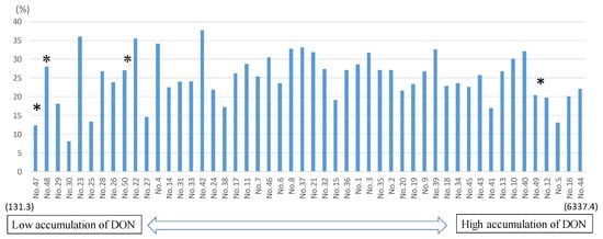 Although it was previously assumed that only Fhb1 has the ability to detoxify DON into D3G, it now appears that other FHB resistance QTLs also have the ability [], as demonstrated by our finding that even the highly susceptible varieties had high D3G/DON ratios, and that lines harboring Fhb1 had a wide range of D3G/DON ratios, from 8.1 to 36.0%. The underlying mechanism of FHB resistance should be investigated in future studies.