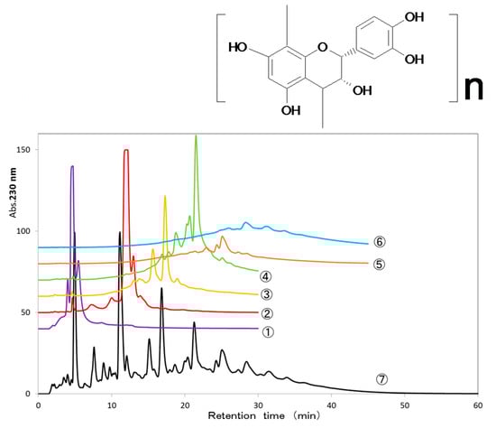 Analytical HPLC chromatograms of the oligomeric procyanidin (PC) constituents in crude apple polyphenols (AP) mixture (No. 7) and those in preparative HPLC fractions (No. 1–6) obtained from the AP mixture. Both conditions of the preparative and analytical HPLCs are described in the Section 4.2. The oligomeric PC constituents in the fractions 1–6 are as follows; No. 1 (i.e., fr.1): monomer; No. 2: dimer; No. 3: trimer; No. 4: tetramer; No. 5: pentamer; No. 6: greater than pentamer.