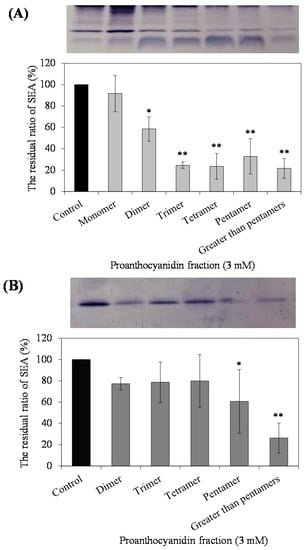 Interaction between procyanidin (PC) fractions and cultured staphylococcal enterotoxin A (SEA) producing strain or purified SEA. (A) Interaction between PC fractions and cultured SEA-producing strains. Staphylococcus aureus C-29 was cultured with six PC fractions in BHI broth for 24 h at 37 °C; (B) Interaction between purified SEA and five PC fractions (di-, tri-, tetra-, penta-, and greater than pentamer) of treated or untreated SEA were incubated for 24 h at 37 °C. Then test samples of treated or untreated SEA were separated by SDS-PAGE under reducing conditions and analyzed by immunoblotting with anti-SEA antibodies. * represents p < 0.05 compared to the control, ** represents p < 0.01 compared to the control. Values represent the mean ± SD for three independent experiments.