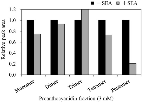 Relative peak area of procyanidin (PC) with or without staphylococcal enterotoxin A (SEA) on the HPLC chromatograms. Each PC fraction (final concentration of 1.5 mM) and purified SEA (final concentration of 100 ng/mL) were mixed and incubated at 37 °C for 24 h. Each fraction was analyzed by HPLC (column, Agilent Zorbax SB-C18 (4.6 × 150 mm I.D., 1.8 μm, Agilent Technologies, Palo Alto, CA, USA); mobile phase 0.5% trifluoroacetic acid (TFA): acetonitrile (87:13); flow rate of 0.6 mL/min). HPLC analysis was repeated twice.