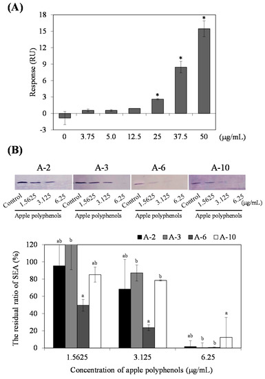 Reaction of staphylococcal enterotoxin A (SEA) and apple polyphenols (AP). (A) Biacore analysis of the binding of AP to SEA. The affinity of AP was examined by surface resonance on a Biacore 2000 biosensor instrument, with SEA immobilized on the flow cell of the sensor chip CM5. Binding responses are represented in resonance units (RU). A running buffer was used as a negative control (0 μg/mL). * represents p < 0.05 compared to the control; (B) The interaction of AP on SEA active sites. Each sample was mixed with SEA (4.5 μg/mL) in 50 μL of MilliQ water and incubated at 37 °C for 24 h. Following centrifugation, the supernatant was applied to SDS-PAGE and visualized by Western blot analysis. MilliQ water was performed as a positive control. The residual ratio of SEA protein were determined by Western blot analysis and quantified using ImageJ software (National Institutes of Health, Bethesda, MD, USA). There is a significant difference between different alphabets (Tukey–Kramer test, p < 0.05). Values represent the mean ± SD for three independent experiments.