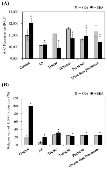 Effect of apple polyphenols (AP) on toxin activity and cytokine production induced by staphylococcal enteroroxin A (SEA). (A) Inhibitory effects of procyanidin (PC) fractions on SEA toxin activity. SEA was exposed to PC fractions or the control (media) and then incubated for 48 h with splenocyte cells. GF-AFC cleavage by splenocyte proliferation was measured by fluorescent AFC, which is quantified at an excitation wavelength of 400 nm and an emission wavelength of 505 nm. Distilled water was used as a control (Cont.). # represents p < 0.05 compared to the SEA (−) control, * represents p < 0.05 compared to the SEA (+) control; (B) Inhibitory effects of procyanidin (PC) fractions on SEA-induced IFN-γ production. AP (0.1 μg/mL) or each PC fraction (0.1 mM) with or without SEA (100 ng/mL) was incubated for 72 h with splenocyte cells, and the IFN-γ production was determined by ELISA. IFN-γ production of SEA alone (SEA (+)) was taken as 100%. SEA (100 ng/mL) was used as a positive control. # represents p < 0.05 compared to the SEA (−) control, * represents p < 0.05 compared to the SEA (+) control. Values represent the mean ± SD for three independent experiments.