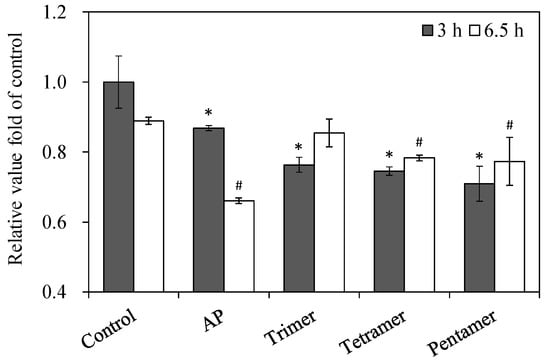 Relative gene expression of sea in Staphylococcus aureus C-29 after incubation with apple polyphenols (AP) and procyanidin (PC) fraction. Samples for RNA extraction were taken at two different times (three hour and 6.5 h old cultures). * represents p < 0.05 compared to the control of the three hour incubation. # represents p < 0.05 compared to the control of the 6.5 h incubation. Values represent the mean ± SD for three independent experiments.