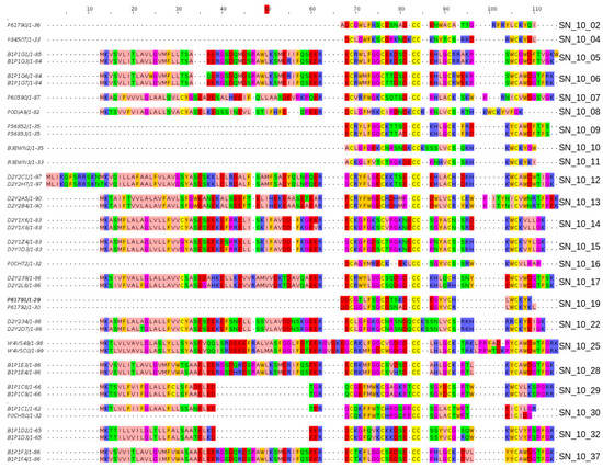 - Waterhouse, A.M.; Procter, J.B.; Martin, D.M.A.; Clamp, M.; Barton, G.J. Jalview Version 2—A multiple sequence alignment editor and analysis workbench. Bioinformatics 2009, 25, 1189–1191. [Google Scholar] [CrossRef] [PubMed]