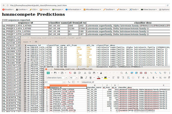 The score obtained by a sequence for a given model reflects how closely the sequence is from the original alignment used to create the model. In addition, HMMs are predictive models able to identify remote homologous sequences. Consequently, building HMM classifiers for closely-related sequences necessarily implies closely-related models, which may match a single sequence during the hmmsearch process. This will result in a very large report file where every sequence may have several hits from these closely-related models showing closely-related bit scores. This situation can be annoying when a sequence database is searched using an HMM database. It cannot be avoided and requires a post-processing of the initial matching result. We, therefore, introduce the hmmcompete command line program as an add-on tool for the HMMER3 suite. hmmcompete is intended to monitor the classification realized by using a provided HMM dataset to match given peptide queries and to internally realize the post-processing step in order to provide only the best classification to the user. Protein query sequences must be given in FASTA format. hmmcompete produces modulable outputs users can visualize thanks to either text editors, spreadsheet software, or even web browsers. The possibility to display only desired columns in the result makes the tool handier (Figure 2).