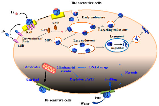 Mode of action of iota-toxin in various cells. Upper part (Ib-insensitive cells): Ib associates with a receptor (LSR: lipolysis-stimulated lipoprotein receptor) on the plasma membrane and migrates to membrane lipid raft; Ia bound to Ib oligomers forms on the rafts. Then, the Ia and Ib complex enters the cell. The complex is trafficked to the early endosome, where acidification facilitates the cytosolic release of Ia. Ia ADP-ribosylates G-actin in the cytoplasm, ultimately causing cytotoxicity. Ib is sorted into recycling endosomes and late endosomes. From recycling endosomes, Ib is sent back to the plasma membranes, and this recycling process is critical for Ib to enhance the entry of Ia. From late endosomes, Ib is delivered to lysosomes for degradation, and degraded Ib is exposed on the cell surface. Lower part (Ib-sensitive cells): Ib oligomerizes mainly in non-lipid rafts in the plasma membranes and is not internalized. Ib induces mitochondrial damage, and subsequently gives rise to the depletion of ATP and DNA damage. On the other hand, Ib causes the swelling of cells mediated by Ib pores. Finally, Ib induces cell necrosis.