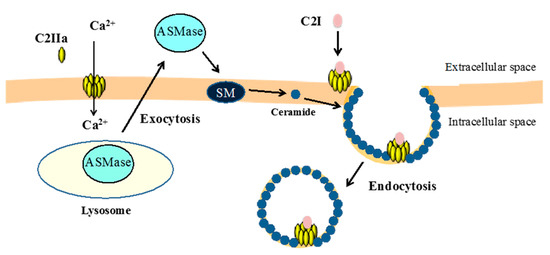 Recently, we demonstrated that C2 toxin needs the activity of acid sphingomyelinase (ASMase) during the initial step of endocytosis [41]. Several bacterial pore-forming cytotoxic proteins cause calcium entry and provoke the exocytosis of lysosomes, leading to the release of lysosomal ASMase to the extracellular medium [42,43]. Next, ASMase converts sphingomyelin in the outer leaflet of the plasma membrane to ceramide [44]. Then, ceramide self-assembles into ceramide-enriched microdomains that bud into cytoplasmic membranes, creating endosomes [45]. Namely, the hydrolysis of sphingomyelin by ASMase secreted from the exocytosis of lysosomes produces plasma membrane microdomains enriched in ceramide, leading to endocytosis [44,45]. C2IIa causes the entry of extracellular calcium into sensitive cells, and the cytotoxic activity of C2 toxin is increased in calcium-containing medium [41]. Blockers of lysosomal exocytosis and ASMase inhibit the cytotoxic activity of C2 toxin. Moreover, C2IIa induces the release of ASMase due to the exocytosis of lysosomes. Then, C2 toxin induces ceramide production in plasma membranes. On the basis of these findings, it is concluded that ASMase activity is required for C2 toxin entry into host cells [41]. In Figure 2, we show a hallmark of the key role of ASMase in the endocytosis of C2 toxin in sensitive cells.