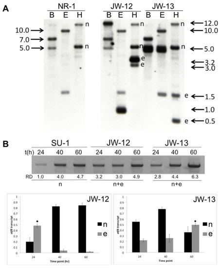 AtfB-silenced strains demonstrate evidence of RNAi-based gene silencing via “quelling”. (A) Molecular analysis of AtfB-silenced strains, JW12 and JW13. Strains NR-1, JW12, and JW13 were grown in YES liquid medium for 40 h, and genomic DNA was extracted for Southern hybridization analysis with an atfB probe (see Methods; Supplement Figure S1). DNA was digested with BamHI (B), EcoRI (E), or HindIII (H) and analyzed using standard methods. Southern analysis of NR-1 (recipient and control strain) derived from wild-type SU-1 demonstrates at least two copies of AtfB by high stringency Southern hybridization analysis (designated ‘n’ for native). Additional bands present in the HindIII digest (restriction site inserted into the silencing construct) are designated ‘e’ for ectopic integration. (B) (top panel) Time course analysis of total atfB transcript in SU-1, JW-12, and JW-13. Primers were used to amplify the full length 957 bp atfB transcript at 24, 40, and 60 h. R.D., relative density as measured by ImageJ densitometry software analysis (Schneider et al., 2012). n: native transcripts expressed by two wild-type AtfB copies; n + e: native and ectopic (transgene) transcripts produced and expressed. A HindIII-cutting assay was conducted on amplified full-length atfB transcripts obtained from strains SU-1, JW-12, and JW-13 after 24 h, 40 h, and 60 h of growth (see Methods). We calculated the ratio of native atfB transcript (n) to total atfB transcript (native AtfB transcript [n] + transgene AtfB transcript [e]), as well as the ratio of the transgene atfB transcript (e) to total atfB transcript (n + e) expressed in AtfB-silenced strains at 24 h, 40 h, and 60 h. The ratios of wild-type atfB transcript (n) to atfB transgene transcript (e) in JW-12 (bottom left panel) and JW-13 (bottom right panel) are represented as bar graphs calculated based on densitometry analysis. The asterisks (*) denote the time point where the transgene transcript is expressed at its highest levels.