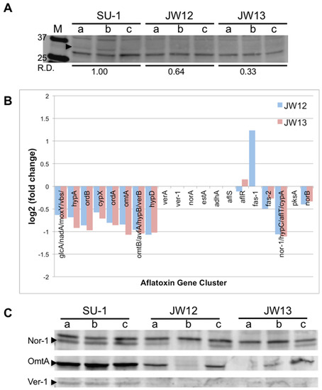 Triplicate cultures of SU-1, JW12, and JW13 were grown in YES liquid medium for 40 h under standard conditions, harvested, and disrupted with a mortar and pestle under liquid nitrogen, and a protein extract was prepared as previously described [2]. Total protein concentrations were measured using the Pierce® BCA Protein Assay Reagent (Thermo Scientific, Waltham, MA, USA). 100 μg of total proteins per lane was separated by SDS-PAGE using a 4–20% gradient Tris-HCl Ready Gel® (Bio-Rad, Hercules, CA, USA) and transferred to polyvinylidene difluoride (PVDF) membranes (PerkinElmer Life Sciences, Waltham, MA, USA). Membranes were exposed to polyclonal anti-AtfB antibodies (YSR, 5 μg/mL) and incubated with goat anti-rabbit secondary antibodies conjugated to the fluorescent tag IRDye 800 CW (Li-Cor Biosciences, Lincoln, NE, USA) as previously described [2]. For aflatoxin enzymes, highly specific antibodies against Nor-1, OmtA, and Ver-1 were used as previously described [46,49,50,51]. Visualization of proteins was performed using an Odyssey infrared imaging system (Li-Cor Biosciences) at 795 nm, as previously described [2].