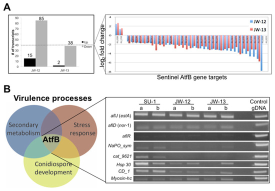 The following are available online at www.mdpi.com/2072-6651/9/9/287/s1, Figure S1: Gene silencing of A. parasiticus AtfB, Figure S2: Genotypic screening of atfB transformants, Figure S3: PCR-based assay for validation of AtfB-silencing, Figure S4: Aflatoxin levels in JW12 and JW13 not detectable by TLC, Figure S5: AtfB immunoprecipitation and peptide competition analysis, Figure S6: Gene ontology visualization of JW12, Figure S7: Gene ontology visualization of JW13, Figure S8: Scatter plots with Spearman’s correlation (R2 > 0.80) showing good agreement between technical replicates of RNA Seq data from A. parasiticus wild-type strain, JW12, and JW13 grown under aflatoxin inducing YES conditions, Table S1: Primers used in this study, Dataset S1: Gene ontology (GO) enrichment analysis conducted on AtfB-silenced strains, JW12 and JW13, Dataset S2: Differentially expressed genes identified by RNA Seq analysis in AtfB-silenced strains, Dataset S3: Statiscally significant differential expression of AtfB sentinel genes identified by RNA Seq analysis in AtfB-silenced strains.