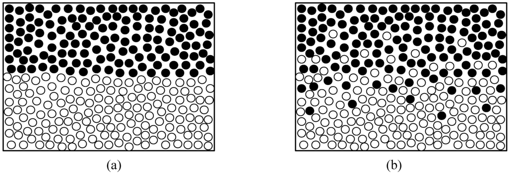 Cartoon illustrating the exchange of molecules across an interface between two different fluids activated by the molecules’ random motion; (a) before starting the exchange, (b) instantaneous state during the exchange.
