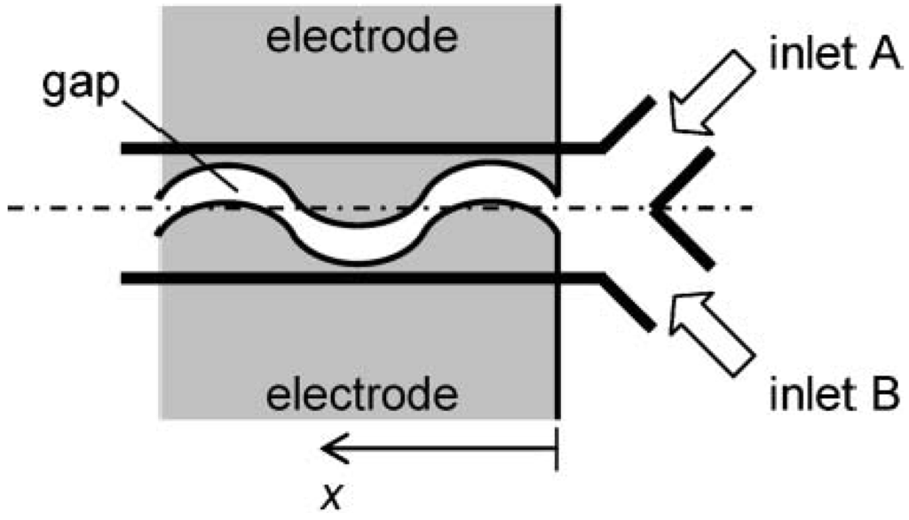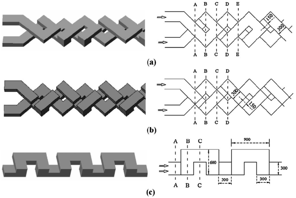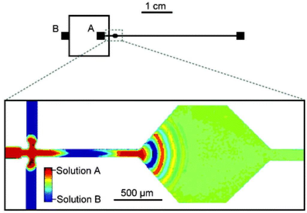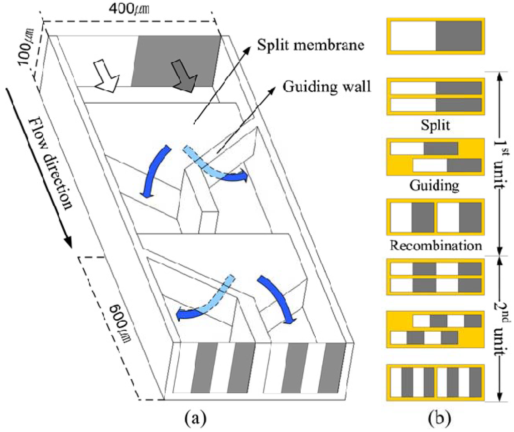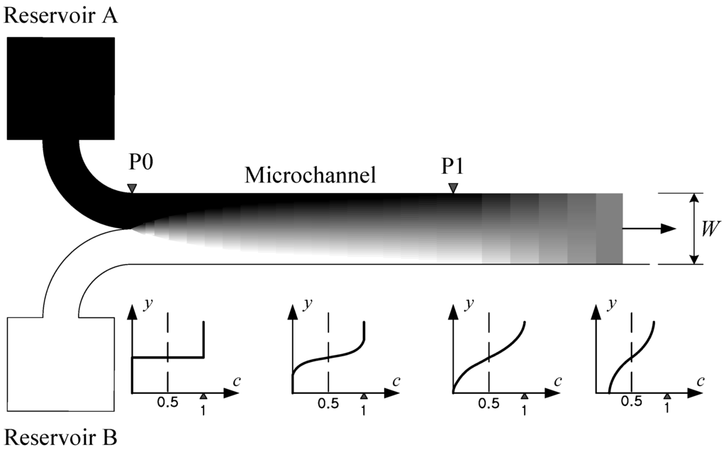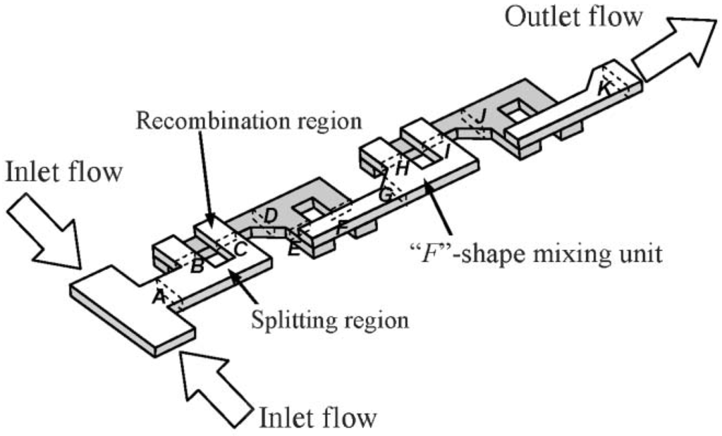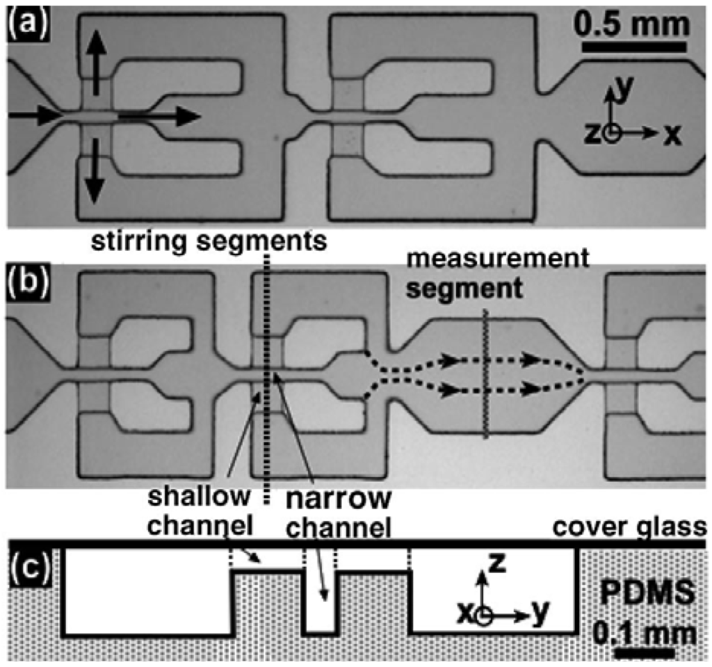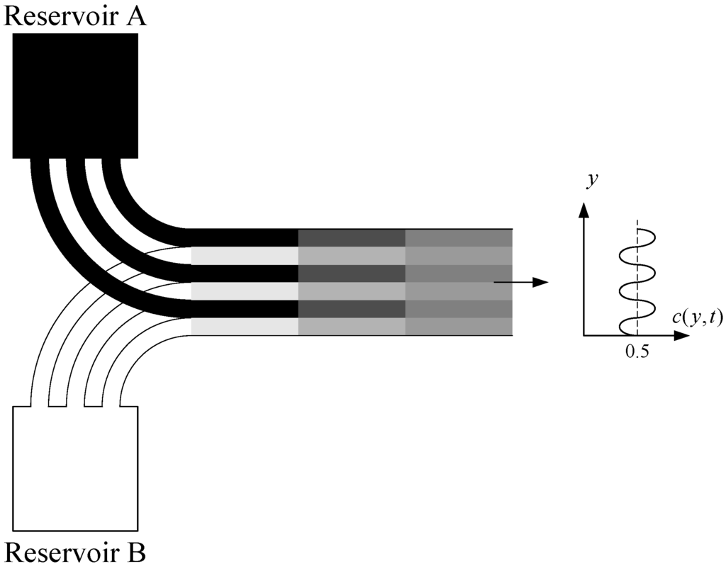 Figure 2 depicts a typical microchannel that has no specific mixing element or structure. Two different fluids from separate reservoirs flow parallel to each other, and therefore no stirring takes place and the mixing is totally diffusive. We designate