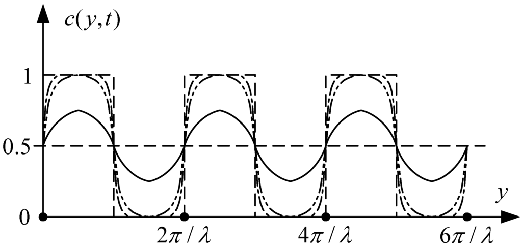 τ) corresponds to the thickness of the interface between the high concentration in the upper region and the low concentration in the lower region. Substituting (3) into (2) and integrating the result over the full range of