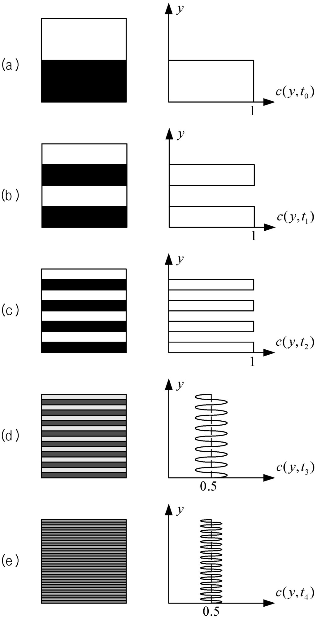 Schematic of a typical concentration distribution (grey level) within a microchannel without a specific mixing element. The graphs below show the concentration distribution as a function of the coordinate normal to the channel wall, y, at several channel sections.