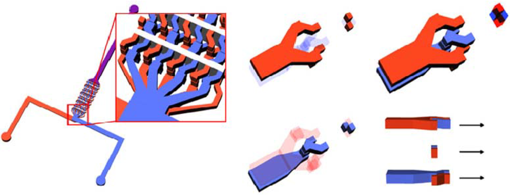 A meandering channel with bumps on the outer side for use in mixing three kinds of liquids (from Liau