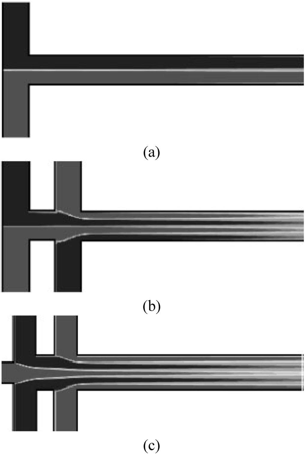 Figure 4 illustrates the typical concentration development along the cross-section of the channel in the hydrodynamic focusing method.