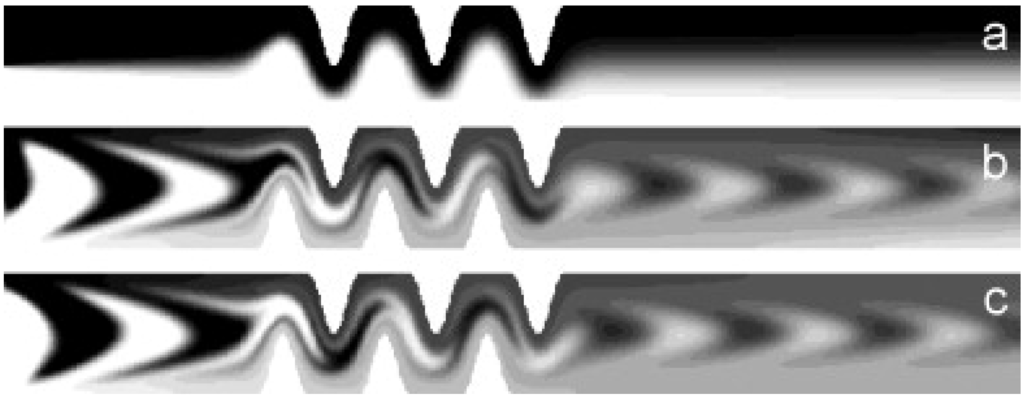 50] performed two-dimensional numerical simulations for the mixing inside a droplet flowing in a wavy channel. It was shown that the best mixing can be obtained when the drop size is comparable to the channel width. The effect of the capillary number is significant; the smaller the capillary number the better the mixing effect. The ratio of the viscosity of the drop to that of the ambient fluid must be as small as possible for better mixing. The effect of the channel geometry on the droplet mixing has been further studied by Tung