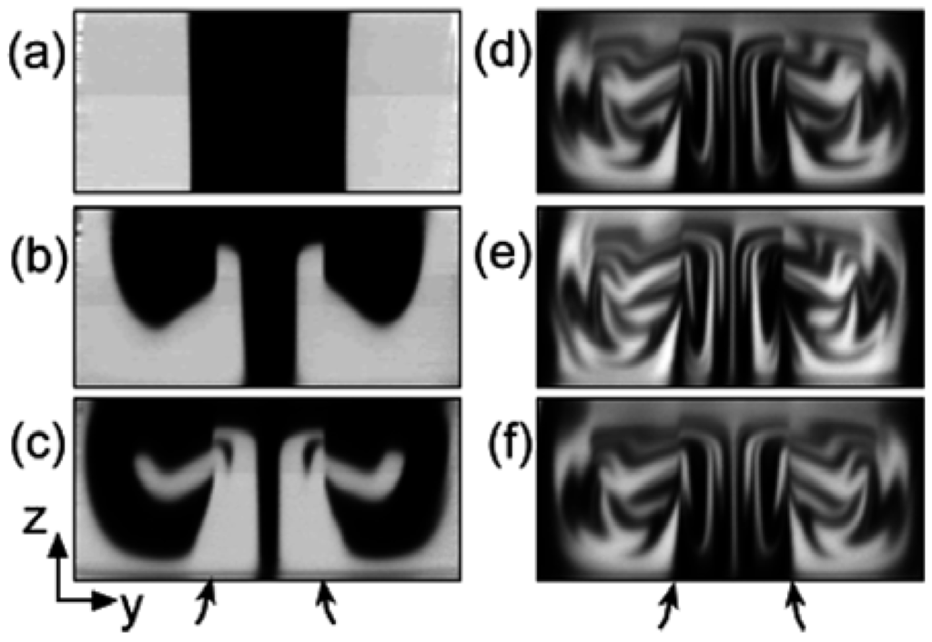47] conducted an experimental study on electrokinetic instability and its use in mixing. Input of two sodium-chloride solutions with different concentrations creates a conductivity gradient across the interface, which yields an electric charge. This charge distribution, coupled with the oscillating external electric field, promotes electrokinetic instability (