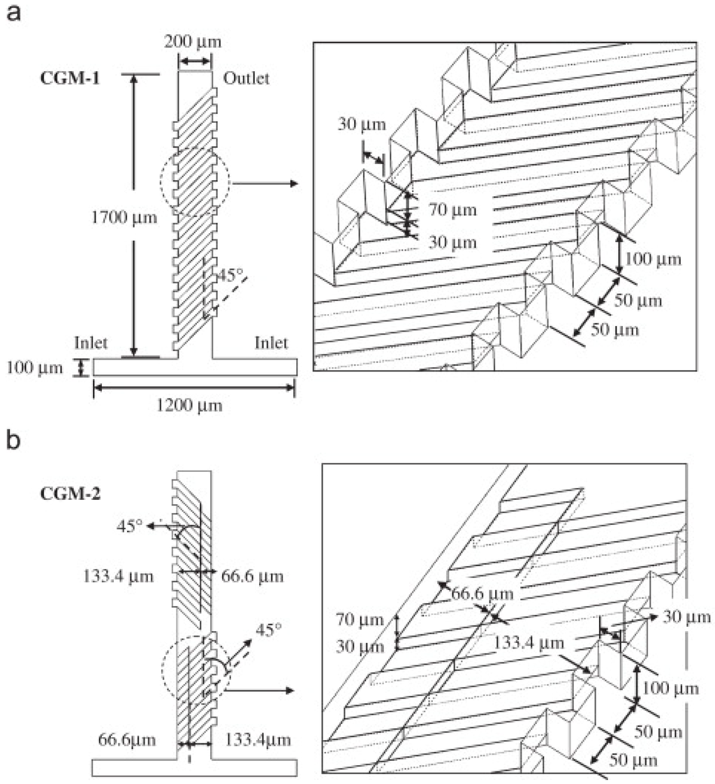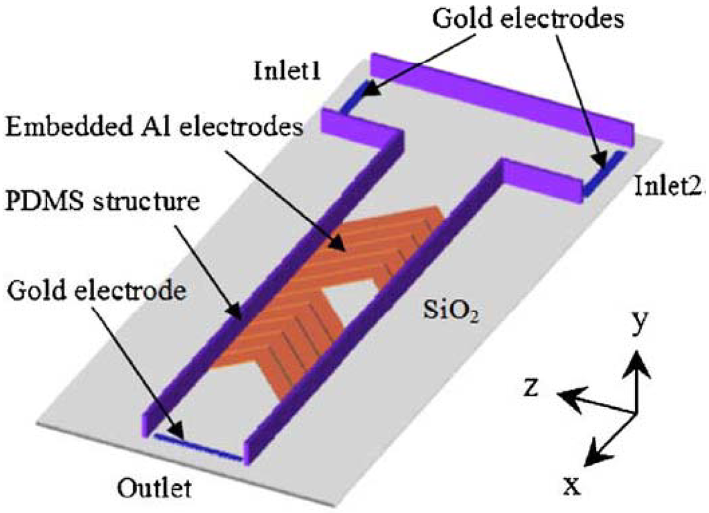 44] considered a “T” channel carrying electrodes on the bottom wall of the channel embedded in a herringbone shape (