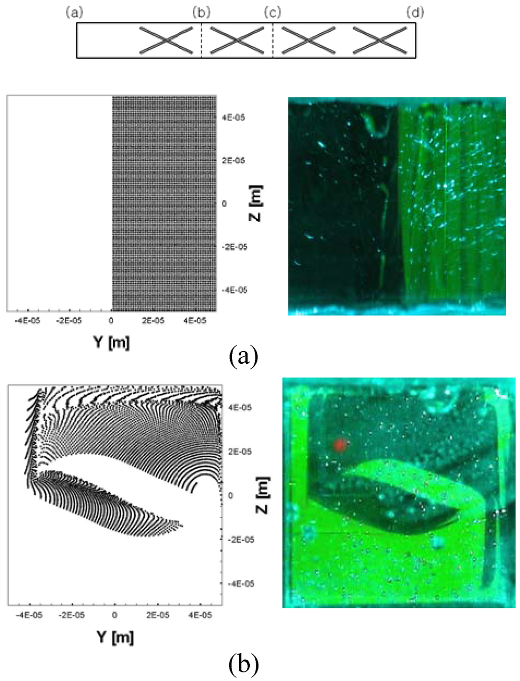 Comparison of the mixing patterns from numerical (left) and experimental (right) results for each section of the channel (denoted as (a), (b), (c) and (d) shown on the top) of a cross-baffle mixer (from Suh