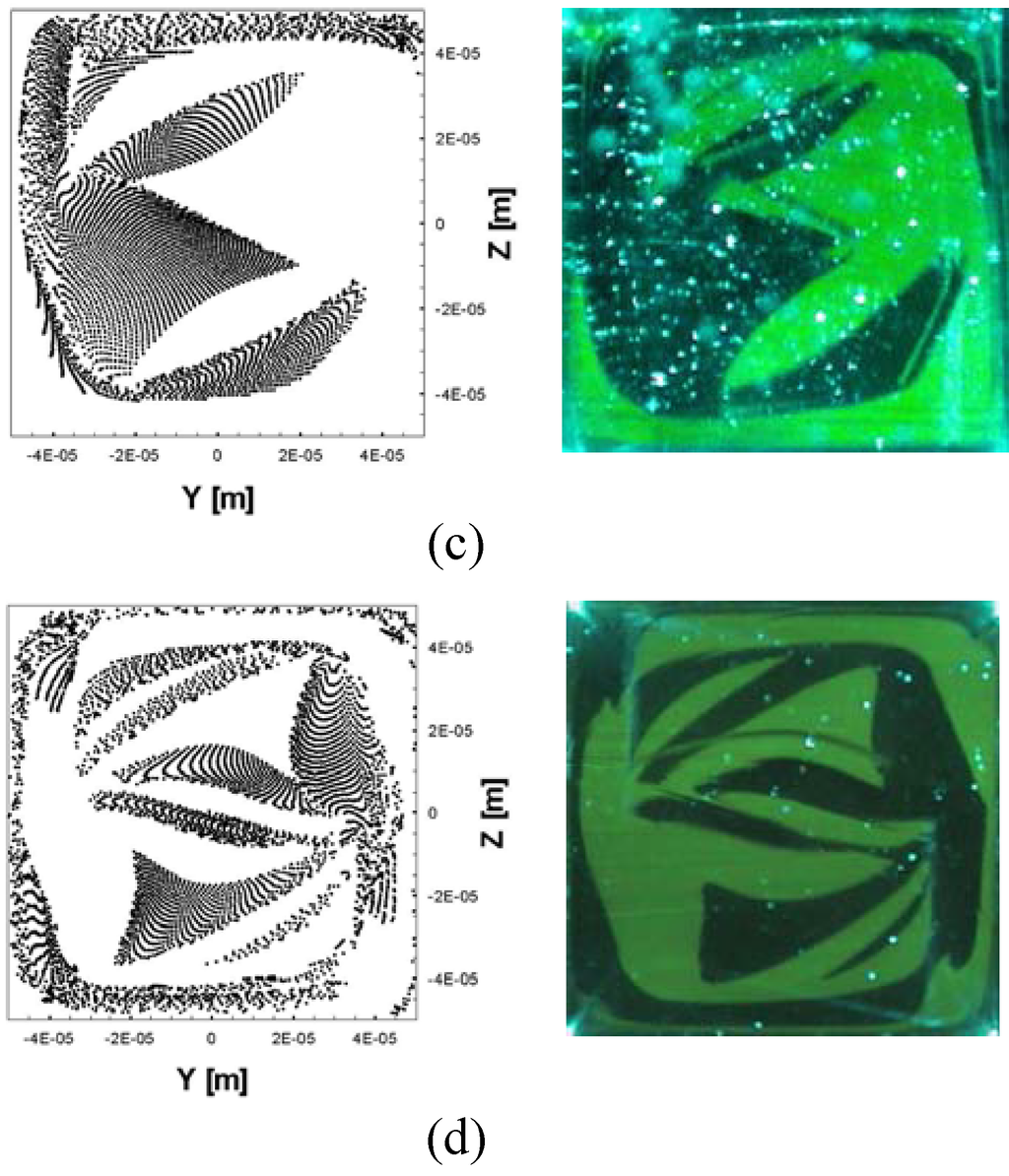 42] demonstrated chaotic advection within a rectangular cavity by employing time-dependent slip velocity on the top and bottom wall segments caused by electroosmosis. They performed a two-dimensional numerical simulation to obtain Poincare sections by using the semi-analytic solution for the Stokes flow within the cavity. The time-dependent zeta potential on the segments of walls could be achieved by adjusting electric potentials applied on the electrodes embedded beneath the wall segments. Zhao and Bau [