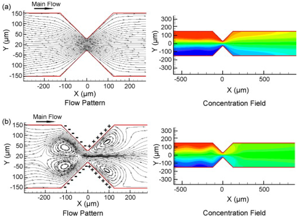 39], the effect of additional wavy walls was also studied. Control of zeta potential on a part of the channel walls can be achieved by one of surface treatment technologies. On the other hand, simply putting conductors on the walls can also create locally vortical flows, as studied both experimentally and numerically by Wu and Li [