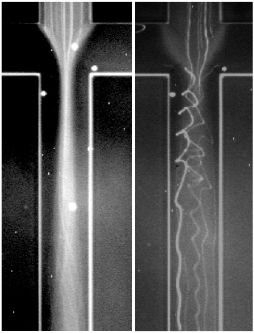 Particle trajectories with static (left-hand-side photo) and time-varying (right-hand-side photo) electric fields at the inlet of the channel (from Shin