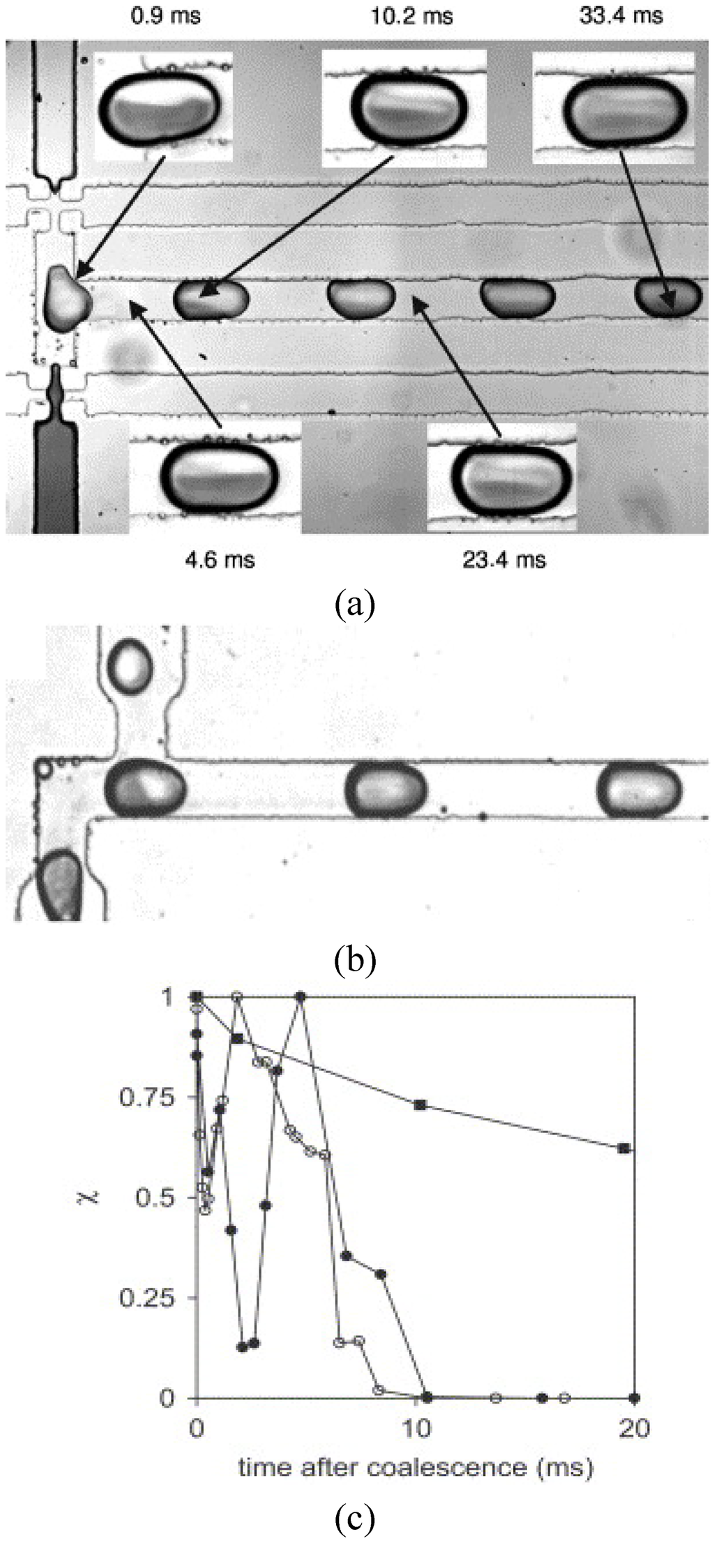 (c): ■, mixing of dye and water in a side-by-side coalescence configuration; ●, mixing of dye and water in a longitudinal coalescence configuration; ○, bleaching reaction in a longitudinal coalescence configuration. Here a low level of