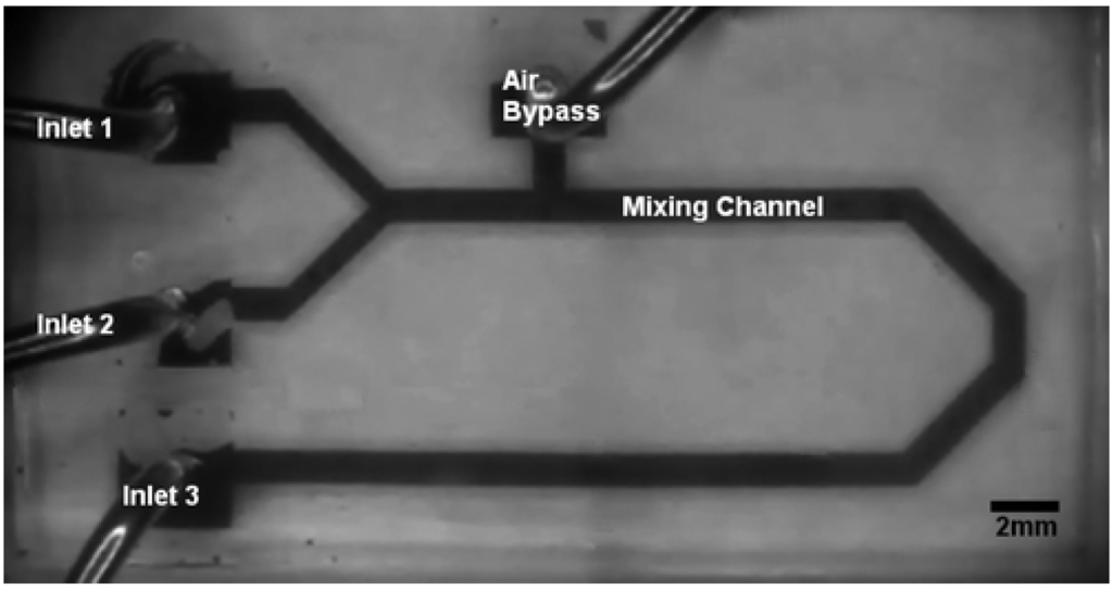 A microchannel mixer with an air-inlet port to produce isolated droplets for better mixing (from Rhee and Burns [