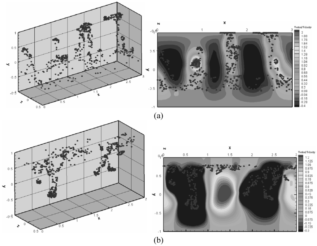 Distribution of magnetic particles (left) and the contours of the vertical velocity component (right) in a microchannel subjected to a time-varying magnetic field applied along the vertical direction; typical patterns during the
